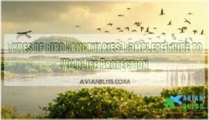 • You’ll find nine distinct sanctuary types – from coastal refuges protecting shorebirds to specialized rookeries supporting colonial nesters – each targeting specific conservation needs and habitats.