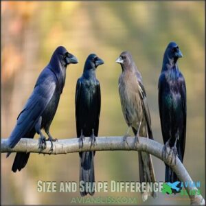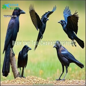 European Starlings stay compact at just 8-9 inches, while Red-winged Blackbirds reach 7-9 inches. Body proportions tell the story too – Ravens sport wedge-shaped tails and sturdy beaks, Crows show rounded tails, and Grackles flash impressively long rudders.