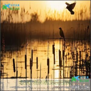 You’ll discover that many black bird species face serious conservation challenges, from habitat loss to population declines exceeding 85% in some cases.