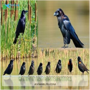 You’ll discover black birds across diverse habitats worldwide – from wetlands and forests to urban areas and grasslands.