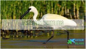 You’ll find the American White Ibis wading through southeastern wetlands with its distinctive curved bill, hunting crustaceans and small fish.