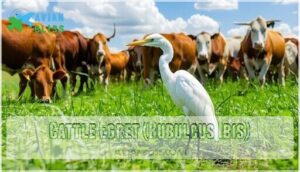 You’ll spot the Cattle Egret following livestock through pastures, creating a perfect cattle symbiosis.