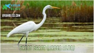 The Great Egret stands as a perfect example of a white bird. You’ll spot this elegant wader in wetlands across North America, standing motionless before striking fish with lightning-fast precision.