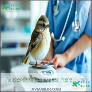 To address your bird’s unexplained weight loss, start by reviewing its diet, ensuring it meets nutritional needs and matches species-specific requirements.