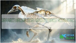 You’ll find that bird skeletons are engineering marvels, with hollow bones that reduce weight by up to 50% while maintaining incredible strength through internal air sacs and reinforced struts.