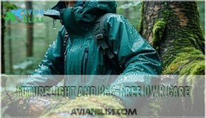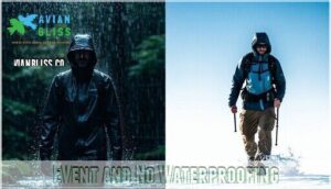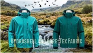- You’ll benefit from advanced waterproof technologies like Gore-Tex (28,000mm+ rating) or Futurelight for superior breathability, while sustainable options like Paramo’s PFC-free treatments protect both you and the environment.