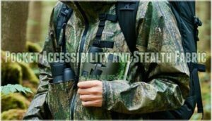 - You’ll want strategic pocket placement for quick gear access, including chest pockets for binoculars and internal compartments for field guides – multiple pocket sizes accommodate different equipment without creating bulk or noise.