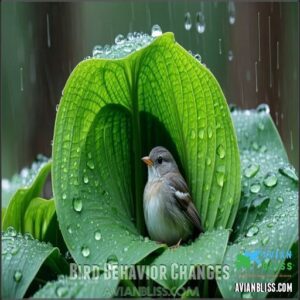 You’ll notice birds dramatically change their behavior when rain clouds gather, shifting from active flying and foraging to energy-conserving postures with flattened feathers and tucked heads.