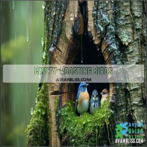During downpours, you’ll find them snug in their wooden sanctuaries, demonstrating roosting behavior that’s essential for winter survival too.