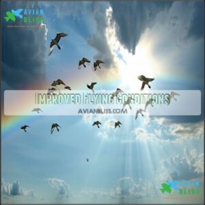 You’ll notice they take advantage of reduced turbulence and changes in air pressure to generate better aerodynamic lift. Their wing saturation decreases as feathers dry, making flight more efficient.
