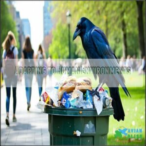 Crows are urban scavengers, often drawn to garbage, trash bins, and dumpsters.