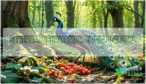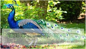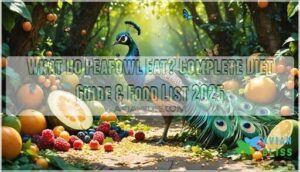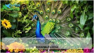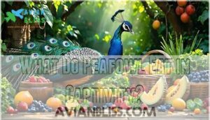 Their beaks work like garden tools, plucking tender shoots and colorful blooms from their surroundings. You’ll find these birds savoring a diverse peafowl plant diet that fuels their spectacular displays.