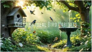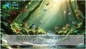 what is ideal bird habitatYou’ll find that ideal bird habitat combines four essential elements: abundant food sources, reliable water access, secure nesting sites, and protection from predators.
