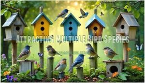 Diverse habitats emerge when you combine various birdhouse dimensions for specific species, offering seed variety and natural nesting materials nearby.