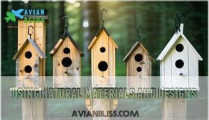 Natural designs in earth tones attract more birds than bright colors, and it’s crucial to follow your birdhouse hole size guide precisely—proper entrance hole size determines which species you’ll welcome to your backyard sanctuary.