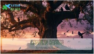 You’ll see birds seek out dense foliage, tree cavities, and sheltered spots to hide from predators as night falls. Smart birds know secluded roosts are key for peaceful slumber.