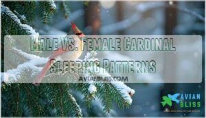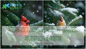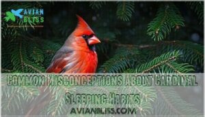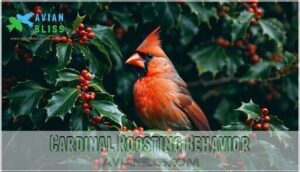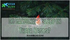 - You’ll discover cardinals don’t actually sleep in their nests at night—they use separate roosting spots in dense shrubs, evergreen trees, or thick brush where their bright red feathers won’t make them easy targets for owls and hawks.