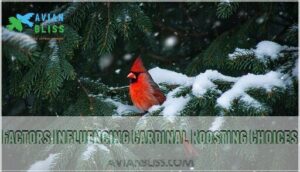 Beyond weather patterns, you’ll find that habitat availability shapes where cardinals choose their nighttime retreats.