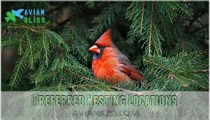 You’ll find cardinals choosing dense shrubs and evergreen trees for their homes, typically at a nesting height of 3-15 feet above ground.