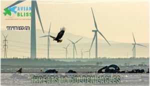 - These powerful raptors face serious threats from human activities including wind turbine collisions, lead poisoning from ammunition, habitat loss, and illegal shooting – accounting for over 70% of golden eagle deaths.