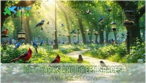 You’ll discover surprising species in these green infrastructure spaces, from robins to hawks. Park management creates perfect conditions for backyard bird attracting opportunities through strategic landscaping.