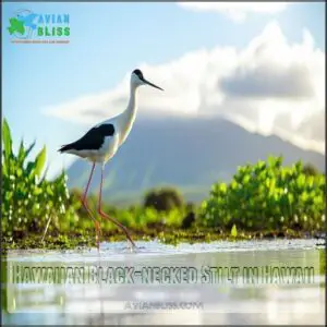 The Hawaiian Black-necked Stilt, a striking wetland bird with long pink legs and elegant black-and-white plumage, thrives in Hawaii’s shallow waters.