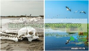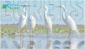 - Conservation efforts have successfully restored many populations – while species like Great Egrets recovered from near-extinction after plume trade protections, you should know that habitat loss and climate change still threaten these magnificent birds, making wetland protection crucial for their survival.