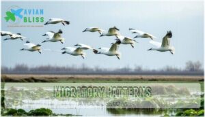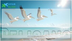 You’ll spot the American White Pelican‘s cooperative fishing techniques as flocks work together to corral fish. These remarkable water birds showcase fascinating pelican behavior during pelican migration seasons.