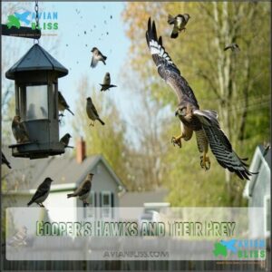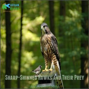 Sharp-shinned hawks often snatch songbirds like robins and sparrows, while Cooper’s hawks prefer medium-sized avian prey such as doves and woodpeckers.