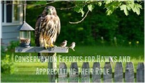 Rather than viewing hawks as threats, consider their ecological role as essential maintenance workers. They’re nature’s way of keeping everything in balance, ensuring your yard remains a sustainable habitat for diverse wildlife populations.