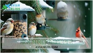 You’ll need proper feeding techniques to keep your backyard birds healthy and well-fed throughout winter’s harsh conditions.