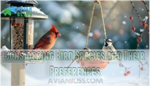 You’ll need to match your bird food selection to the specific species visiting your yard, since cardinals prefer sunflower seeds while finches gravitate toward nyjer seed.