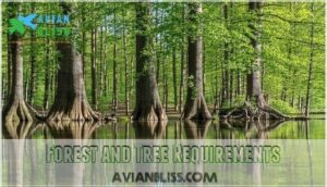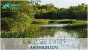 Forest ecosystems with shallow water create ideal conditions for these waterfowl. You’ll find them in wooded swamps, beaver ponds, and tree-lined streams where wetland conservation efforts maintain the aquatic habitats they need for survival.