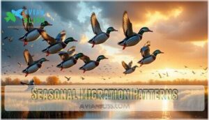 Beyond territorial displays, wood ducks showcase impressive flight agility through dense woodlands. You’ll observe their erratic, darting flight patterns as they weave between trees with quick directional changes.