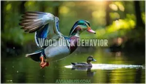 After nesting, you’ll notice wood ducks display fascinating social dynamics. Males practice mate-guarding behavior rather than defending fixed territories, chasing rival drakes during mating season.