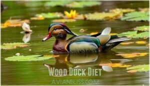 Wood ducks are nature’s flexible eaters, thriving on an omnivorous diet that changes to whatever their wetland homes provide. Their feeding habits showcase remarkable versatility, with diet composition shifting between plant materials and animal prey based on seasonal availability and energetic needs.