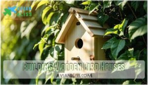 You’ll find wooden bird house designs that combine natural materials with decorative details to attract various bird species.