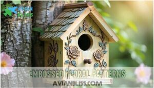 These designs feature rot-resistant redwood construction and embossed floral patterns that create both functional nesting spaces and attractive garden decorations, making them a great addition with natural materials.