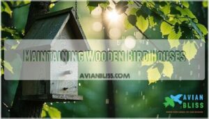 - You’ll need to maintain your wooden bird house by cleaning it twice yearly, checking for damage regularly, and applying animal-safe sealant every 2-3 years to ensure long-lasting protection.