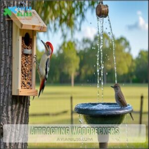 You’ll increase your chances of attracting Texas woodpeckers by installing specially designed nest boxes with properly sized entrance holes and maintaining a reliable water source, such as a bird bath with moving water.