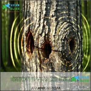 Territorial drumming varies in frequency and rhythm—Pileated woodpeckers produce slow, resonant drumming while Downy woodpeckers create rapid, light sequences.