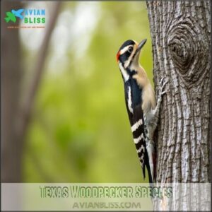 - You’ll find 16 types of woodpeckers in Texas, ranging from the tiny Downy Woodpecker to the crow-sized Pileated, each adapted to diverse habitats like forests, parks, and urban areas.