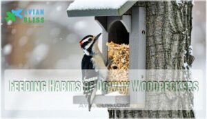Setting up woodpecker feeders in Nebraska requires strategic feeder placement for maximum results. Position suet feeders on mature trees, away from windows to guarantee woodpecker safety.
