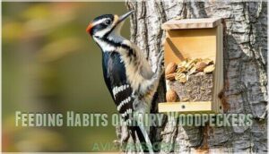 These trees offer natural food sources and nesting sites that attract Downy Woodpeckers and Hairy Woodpeckers consistently. You might even spot a Hairy Woodpecker, which has a larger beak size.