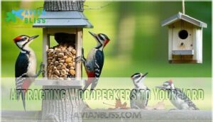 You can easily transform your backyard into a woodpecker haven by providing the right food sources and habitat features that these remarkable birds need to thrive.