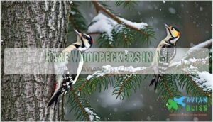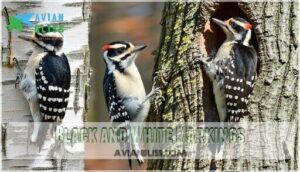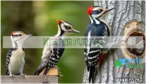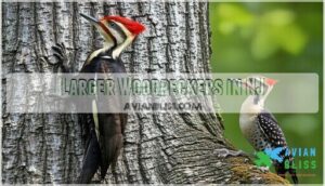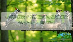 - You’ll find nine distinct woodpecker species in New Jersey year-round, ranging from the tiny Downy Woodpecker to the massive crow-sized Pileated Woodpecker, each with unique markings and behaviors that make identification easier once you know what to look for.