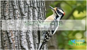 Sure thing! Picture this: the Hairy Woodpecker struts onto the scene with an air of ‘I’m here, deal with it,’ showing off its larger size and that chisel-like bill that says, ‘I mean business.’ Unlike its smaller counterpart, the Downy Woodpecker, the Hairy Woodpecker boasts a more substantial presence, allowing it to tackle tougher tasks with its robust bill.