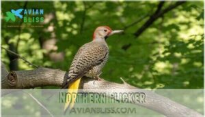 The Yellow-shafted Northern Flicker boasts vivid yellow wing and tail feathers, often found in eastern woodlands, while the Red-shafted variety flaunts striking red hues in the same areas as the western counterpart.