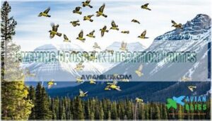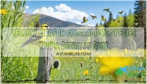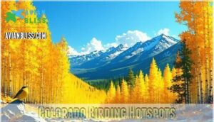 You’ll discover Colorado’s yellow birds across diverse landscapes from towering peaks to sprawling grasslands. Mountain Hotspots like Rocky Mountain National Park and Maroon Bells offer prime identifying yellow birds opportunities during Best Seasons of May through September.